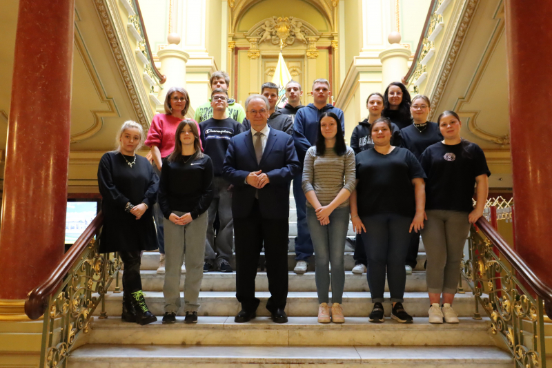 Nach einer Führung durch die Staatskanzlei hatten die Schülerinnen und Schüler die Gelegenheit, sich mit dem Ministerpräsidenten auszutauschen. Sie sprachen offen über ihre Perspektiven, Träume und die Bedeutung des Hauptschulabschlusses für ihre Zukunft.