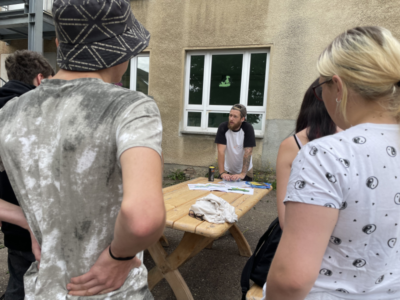 In einem Graffitiworkshop haben die ausgewählten SchülerInnen der Klassenstufe 7-10 von dem Künstler zuerst theoretische Infos rund um das Thema Graffiti erhalten und dann ging es direkt an die Spraydose.